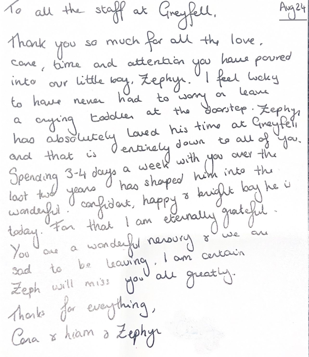 "Xander has attended GreyFell Academy from being 9 months old, and has transitioned from the under two's room all the way to pre school. Over the last 2 1/2 years I have watched my son flourish in the care of some of the kindest, compassionate staff you could ever wish to meet in an environment that allows children to flourish and really discover who they really want to be. The outdoor area is the ultimate highlight for us as our little man loves nothing more than the great outdoors. If I could keep Xander at Greyfell throughout his education I would!" (Parent,24)